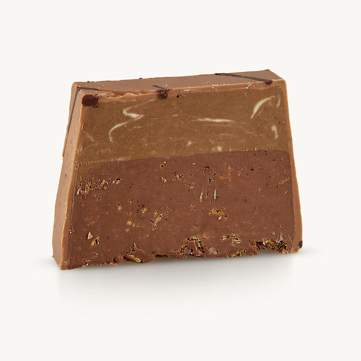 Torrone doppio strato cremino al caffè e gianduia con chicchi di caffè tostati e cerealini croccanti al miele.