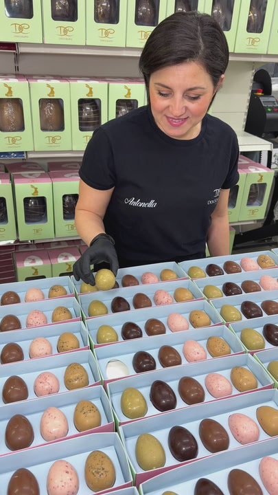 Un elegante cofanetto che custodisce 5 prelibatezze di ovette di cioccolato, ciascuna un viaggio sensoriale unico: Cioccolato al pistacchio con granella di pistacchi tostati, per un incontro di cremosità e croccantezza. Cioccolato al latte con crespearls, che regala un perfetto equilibrio tra dolcezza e texture croccante. Cioccolato al carmello con chicchi di caffè tostati, una combinazione avvolgente e dal carattere deciso. Cioccolato fondente con fave di cacao tostate e granellate, un esperienza intensa e sofisticata. Cioccolato bianco con lamponi liofilizzati che dona una freschezza fruttata e delicata. Un lusso da gustare, ideale come regalo esclusivo o per un piacere personale senza pari.Dal momento dell’arrivo del prodotto è preferibile consumarlo entro 6 mesi. Inoltre si consiglia di conservare il prodotto in un luogo fresco e asciutto, lontano da fonti di calore, e soprattutto non in frigo per evitare l’alterazione di sapore del cioccolato.