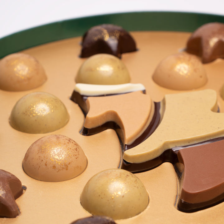 Le praline, frutto di maestria artigianale, racchiudono sapori eleganti e sorprendenti, pensati per deliziare anche i palati più esigenti. La forma tonda della confezione e l’alberello centrale creano un oggetto scenografico, perfetto come regalo di prestigio, doni aziendali o per celebrare le feste con stile.
