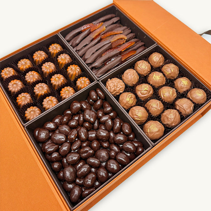 Essenza di Cacao – Cofanetto Regalo con Scorzette d’Arancia, Tartufi e Praline al Cioccolato Fondente