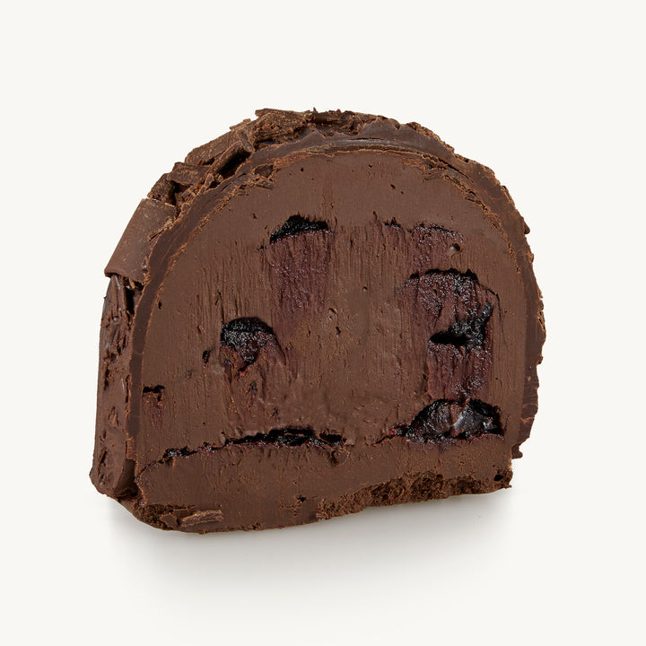 Torrone cremoso cioccolato fondente con fava di cacao granellata, amarene e profumo di fava di tonca.