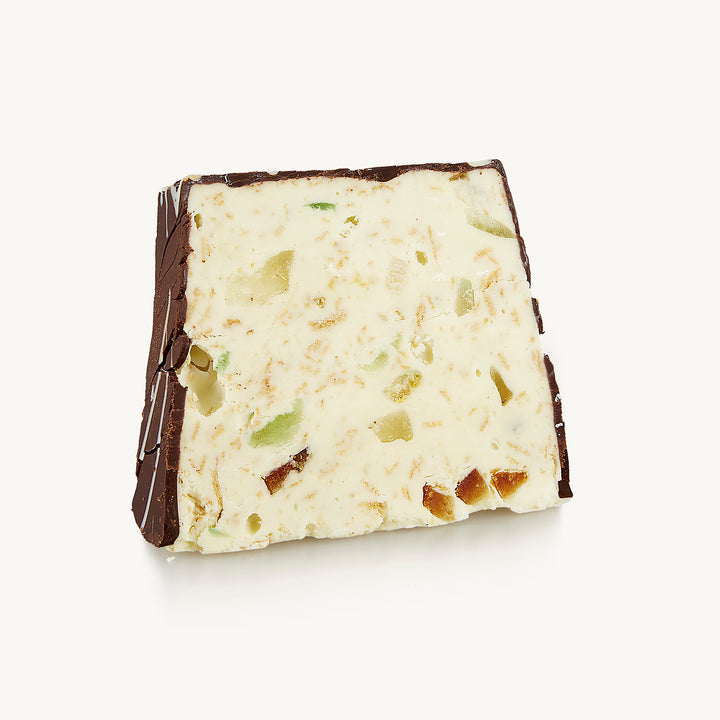 Torrone cremoso al cioccolato bianco con canditi ( Arance, limoni, mandarini e ciliegie) e cialda croccante di cannolo