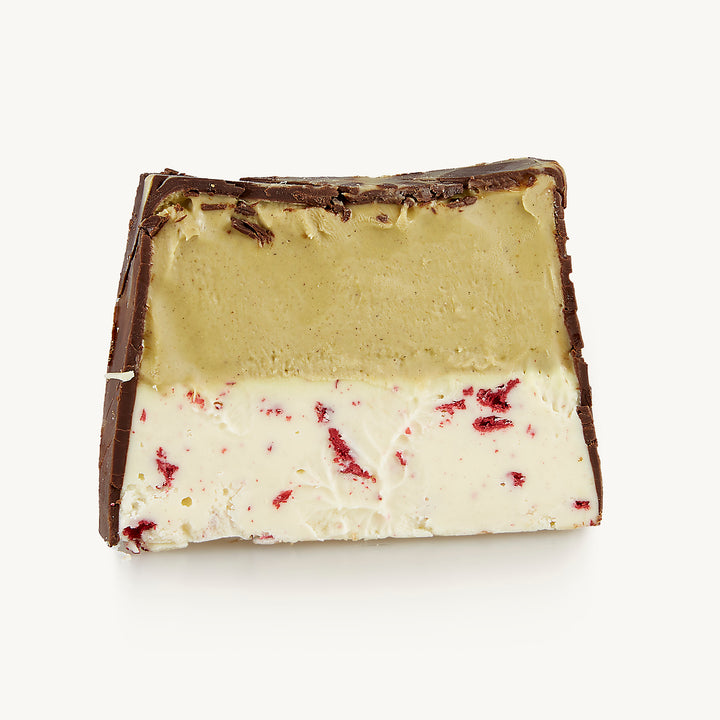 Torrone doppio strato pistacchio e cioccolato bianco con pistacchi tostati e more cristallizzate.